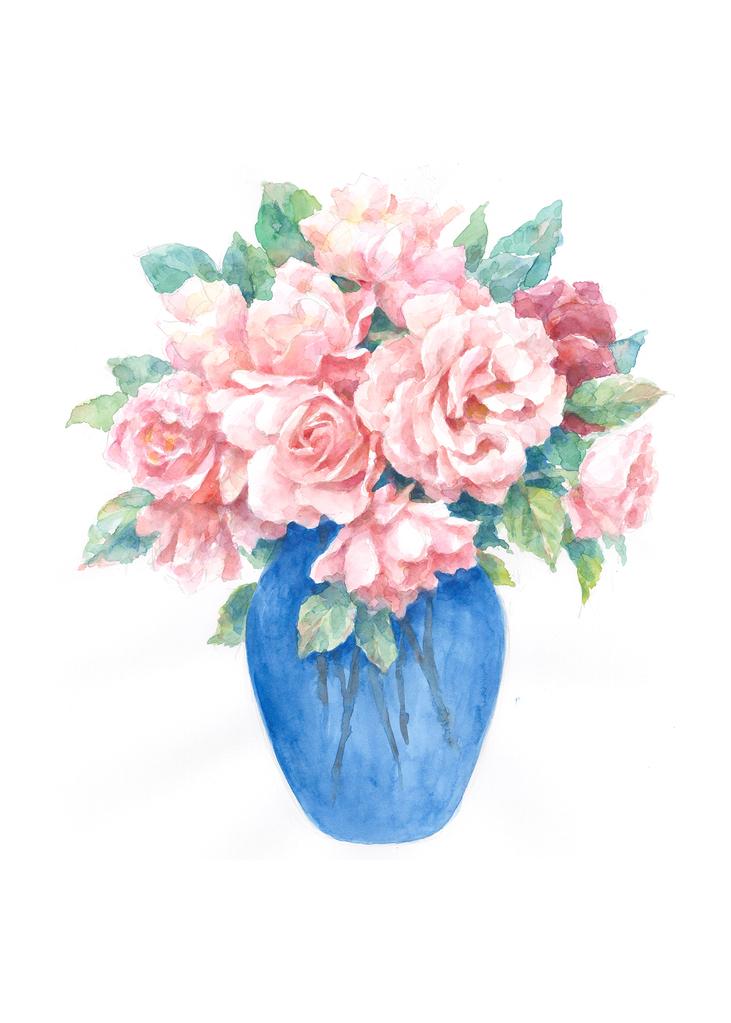 Carols Rose Garden Fancy Pink Rose Bouquet Blue Vase Flower Watercolor Box of 10 Note Cards 4x5 H-ROS201 | 1831-4x5 | 260947