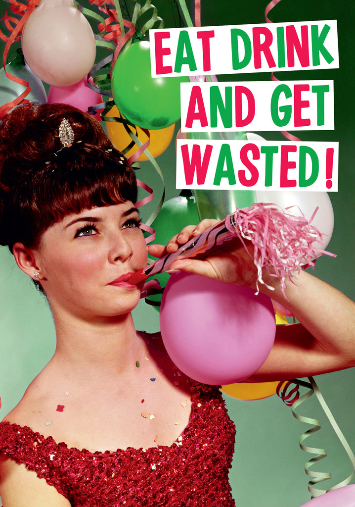 Dean Morris Eat Drink Get Wasted Young Woman Party Balloons Funny Holidays Greeting Card 5x7 DMX233 | 259878