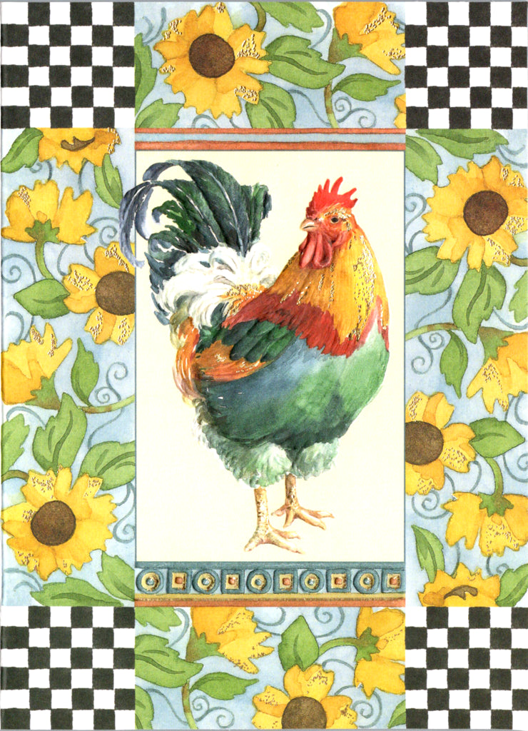 Colorful birthday rooster on checkerboard and sunflower background embossed die cut general birthday greeting card by Carol Wilson. Inside: Happy Birthday! Retail $2.95 | CG1151 | 255872