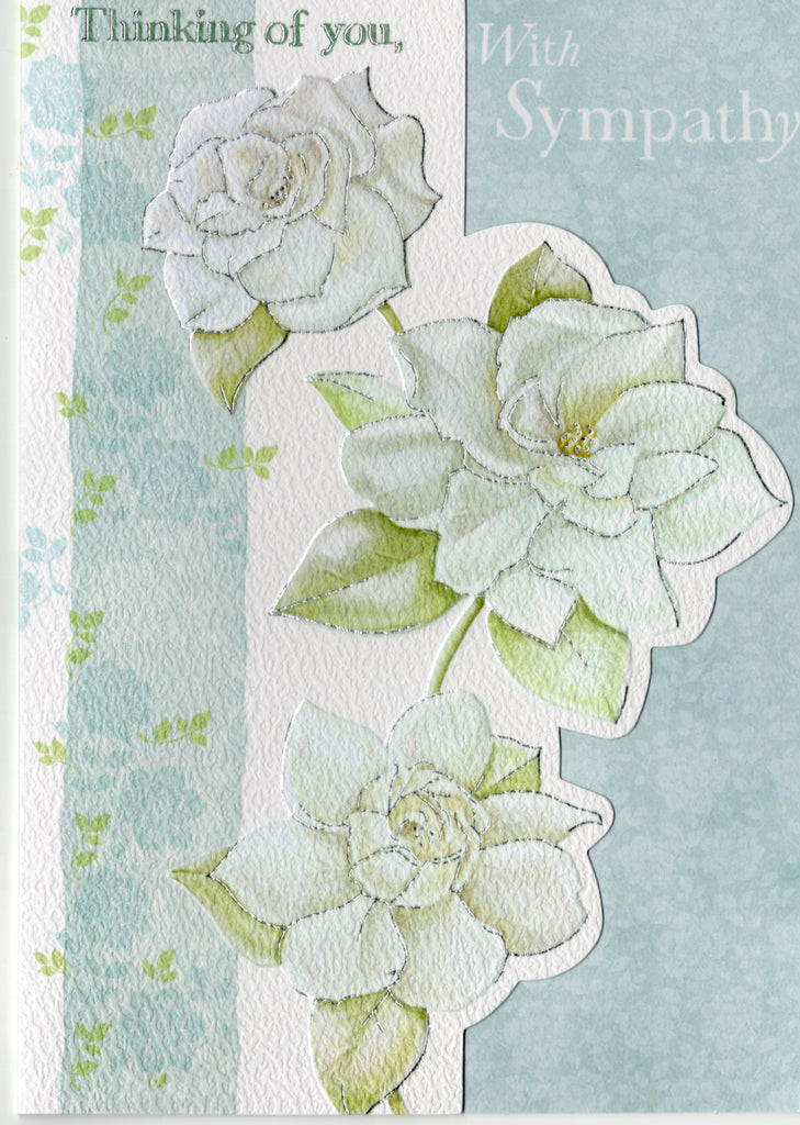White gardenias- Sympathy greeting card. Retail $3.49. Inside: Hoping it will help somehow to know that kind thought... | 5154 | 255736
